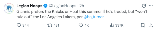 根据湖人记者Ryan Rueda的说法,雄鹿队没有在交易截止日前送扬尼斯的原因之一就是,字母哥希望在今夏与东契奇并肩作战,而且他知道湖人在休赛期开出的筹码会比交易截止日更好,也能帮助雄鹿队。